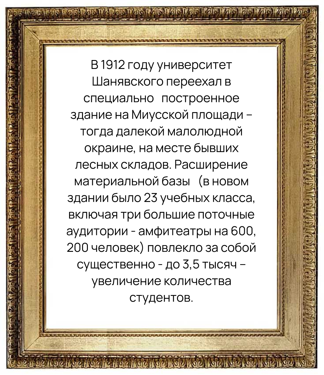 Один из первых частных университетов Российской империи, принимавший студентов обоих полов без цензов и ограничений, и дававший образование мирового уровня. Московский городской народный университет имени А.Л. Шанявского изначально был создан на средства генерала и золотопромышленника Альфонса Леоновича Шанявского. Дарственную будущему университету на собственный дом (ул. Арбат, 4) Шанявский подписал в последний день своей жизни. Непосредственной организацией университета, а затем и руководством его текущей деятельностью, занимался попечительный совет, куда вошли вдова Лидия Алексеевна Шанявская, известные российские политики и меценаты, а также выдающиеся ученые — невропатолог Владимир Карлович Рот, историки Максим Максимович Ковалевский и Николай Васильевич Сперанский, правоведы Сергей Андреевич Муромцев