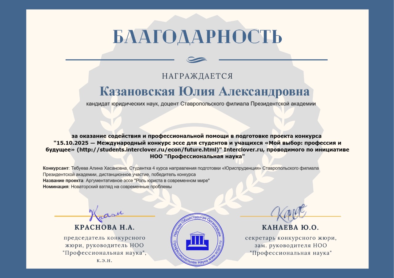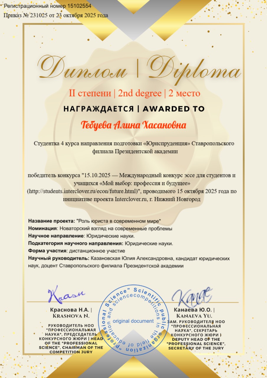Алина Тебуева, студентка 4 курса направления подготовки «Юриспруденция» Ставропольского филиала Президентской академии стала лауреатом II степени в номинации «Новаторский взгляд на современные проблемы», представив проект «Роль юриста в современном мире» на Международный конкурс эссе для студентов и учащихся «Мой выбор: профессия и будущее».
