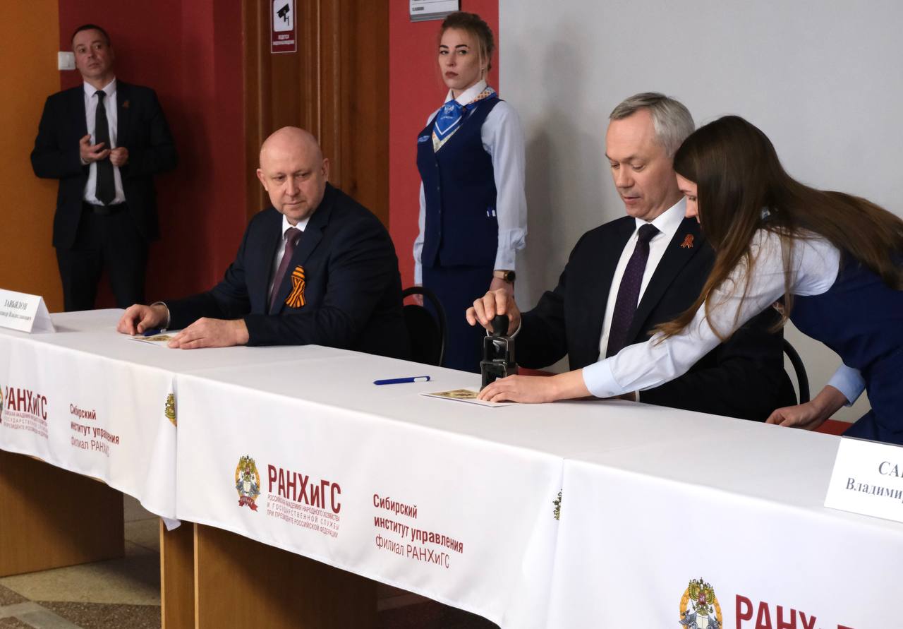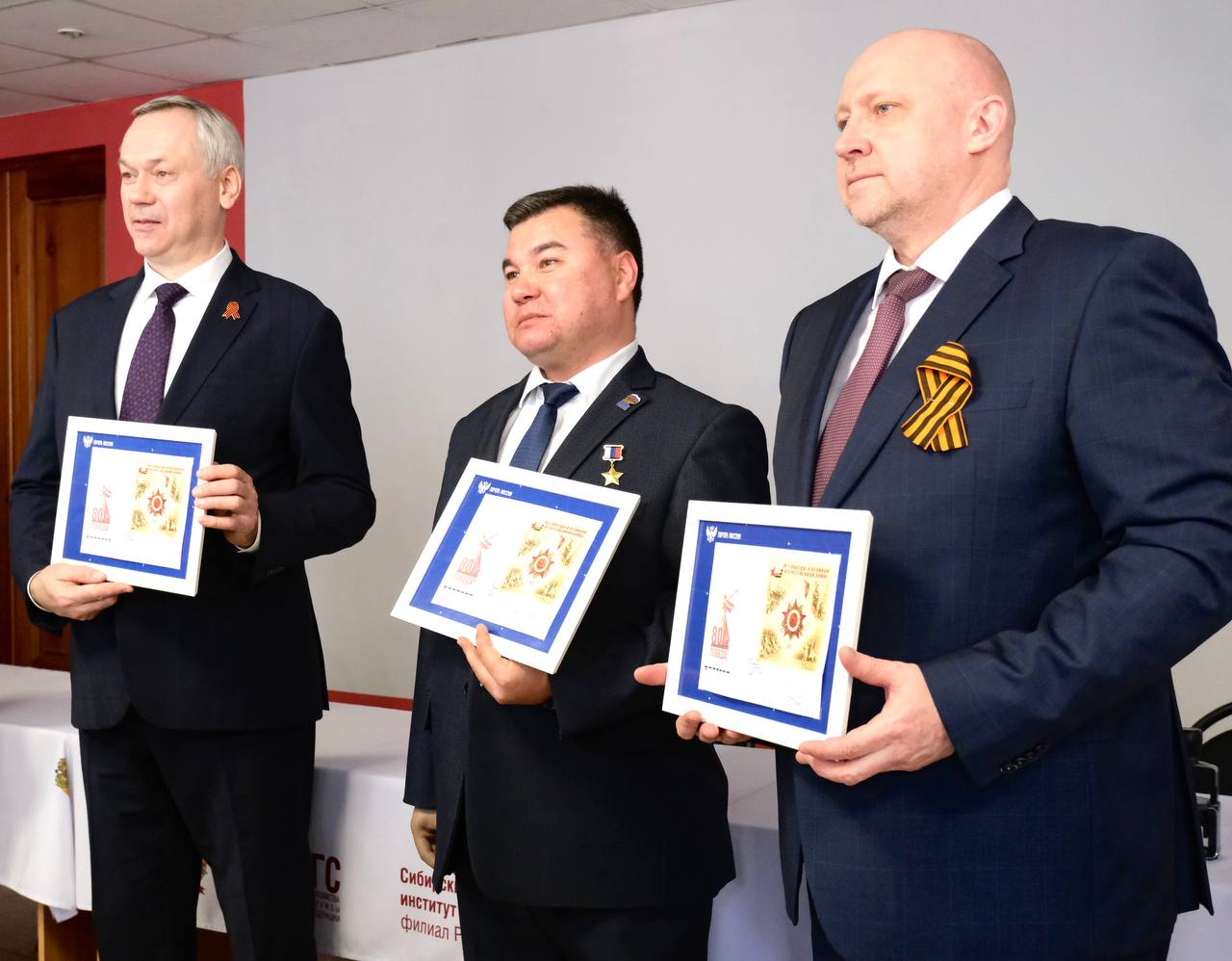 В Президентской академии в Новосибирске состоялась церемония памятного гашения марки, посвященной 80-летнему юбилею Победы. Право поставить первый штемпель было предоставлено губернатору Новосибирской области Андрею Травникову, Герою России Владимиру Сайбелю и директору макрорегиона Сибирь Почты России Александру Завьялову.